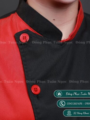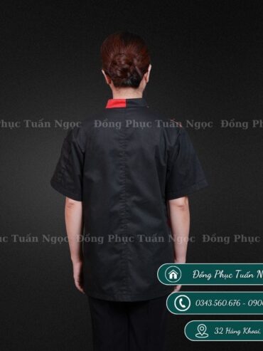• Thiết kế: Ngắn tay, tông màu đen chủ đạo kết hợp nút áo màu đỏ, tạo điểm nhấn cho trang phục